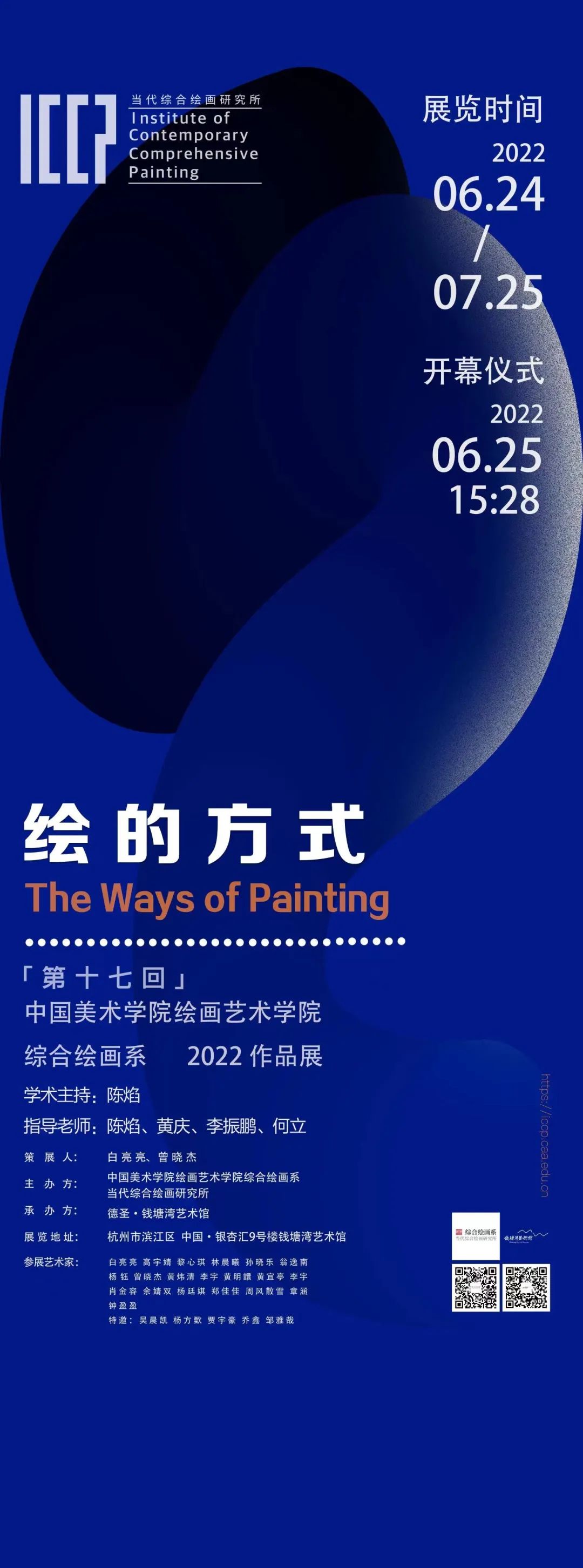 2022年6月25日下午3:28,“绘的方式”第十七回展览顺利开幕,本次展览由中国美院综合绘画系主任陈焰担任学术主持,参加开幕式嘉宾有全国综合艺术委员副主任杨劲松、中国美院综合绘画系首任系主任陈守义、浙江省综合艺委会副主任兼秘书长叶国丰、中国美术学院绘画艺术学院书记方利民,以及来自学校各学院的老师兰友利、胡敏、周刚、曹兴军、郭健濂、张晓锋、贺亮、刘阳、管厚任、郑文昕、王岑予、王建伟、李振鹏、黄庆、何立、郑烨、徐忠波、陈骁。
