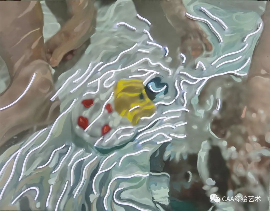 这次创作主要表达,艺术家们在艺术的海洋沉浸,就像画面中所表达的样子,艺术犹如海洋一样没有尽头,当你浮出了海面方向在哪里?你沉浸其中方向又在哪里?这幅画也表达了我此时的心境,想要在艺术的海洋之中找到自己的方向,但又不知道怎么去踏出第一步。也是想让看到这幅画的观众认真思考,未来的方向该指向哪里。